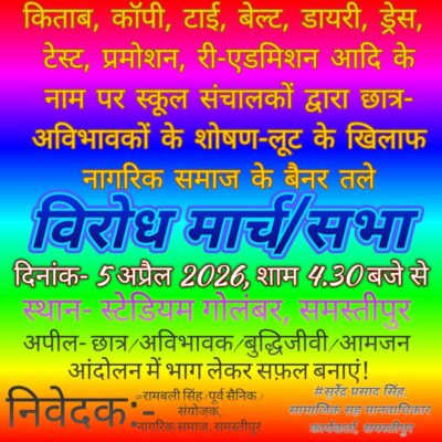 निजी स्कूलों को शोषण-लूट का अड्डा बनाने के खिलाफ समस्तीपुरवासी आंदोलन में भाग लेकर सफल बनाएं- रामबली सिंह। #MNN24X7 समस्तीपुर, […]
