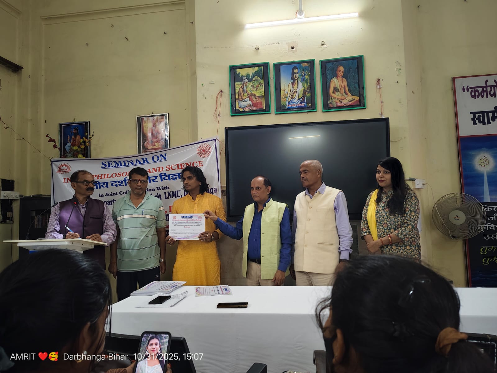 #MNN24X7 दरभंगा, 31 अक्टूबर (संवाददाता)ललित नारायण मिथिला विश्वविद्यालय, दरभंगा के स्नातकोत्तर संस्कृत विभाग एवं डॉ. प्रभात दास फाउंडेशन के संयुक्त तत्वावधान में शुक्रवार को “भारतीय दर्शन और विज्ञान” विषय पर एक दिवसीय सेमिनार का आयोजन किया गया। कार्यक्रम की अध्यक्षता विभागाध्यक्ष डॉ. कृष्णकांत झा ने की, जबकि उद्घाटन अतिथियों द्वारा दीप प्रज्वलन के साथ किया गया।