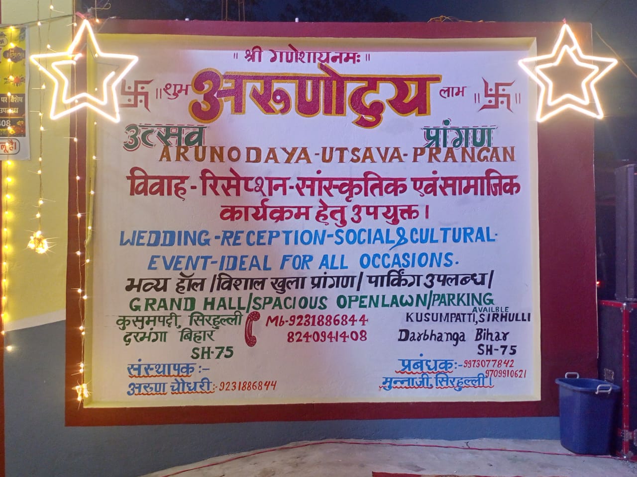 विवाह भवन के स्वामी अरूण चौधरी ने बताया कि ‘अरूणोदय उत्सव प्रांगण’ को अत्याधुनिक सुविधाओं से सुसज्जित किया गया है। ग्रामीण क्षेत्र में स्थित होने के कारण यहां सभी सुविधाएं सस्ती एवं सुलभ दरों पर उपलब्ध होंगी। भवन में पार्किंग की समुचित व्यवस्था, साफ-सुथरे कमरे, विशाल हॉल, मंच, शौचालय युक्त कक्ष, अलग-अलग पुरुष एवं महिला शौचालय, विवाह मंडप, बड़ा मैदान एवं पर्याप्त विद्युत आपूर्ति की सुविधा उपलब्ध है।