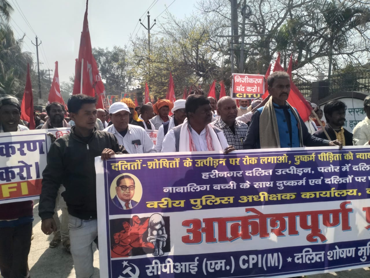 #MNN24X7 दरभंगा, 12 फरवरी वरीय पुलिस अधीक्षक कार्यालय, समाहरणालय के समक्ष सीपीआई(एम) और दलित शोषण मुक्ति मंच की ओर से जिले में बढ़ रहे दलित उत्पीड़न, छोटी-छोटी बच्चियों के साथ दुष्कर्म की घटनाओं में त्वरित कार्रवाई, हरी नगर दलितों पर किए गए सामंती हमले, लूटपाट की घटनाओं में शामिल अभियुक्तों की गिरफ्तारी, पतोर गांव के दलित बिंदेश्वर राम की हत्या से संबंधित मुकदमे में गिरफ्तारी, बहादुरपुर थाना के कौआही दलित बस्ती पर अपराधियों द्वारा की गई फायरिंग में गिरफ्तारी, मिर्जापुर देकुली गांव के दलित पर किए गए हमले के अभियुक्तों की अभिलंब गिरफ्तारी, 6 साल की बच्ची के साथ दुष्कर्म के बाद आम जनता द्वारा किए गए विरोध करने वालों पर लगाए गए मुकदमों की वापसी, दलितों की सुरक्षा सुनिश्चित करने, दलित उत्पीड़न पर रोक लगाने तथा सरकारी सहायता प्रदान करने की मांग को लेकर समाहरणालय एवं वरीय पुलिस अधीक्षक कार्यालय के सामने विशाल विरोध प्रदर्शन आयोजित किया गया। मांगों से संबंधित पत्र जिला पदाधिकारी एवं वरीय पुलिस अधीक्षक को सौंपा गया।