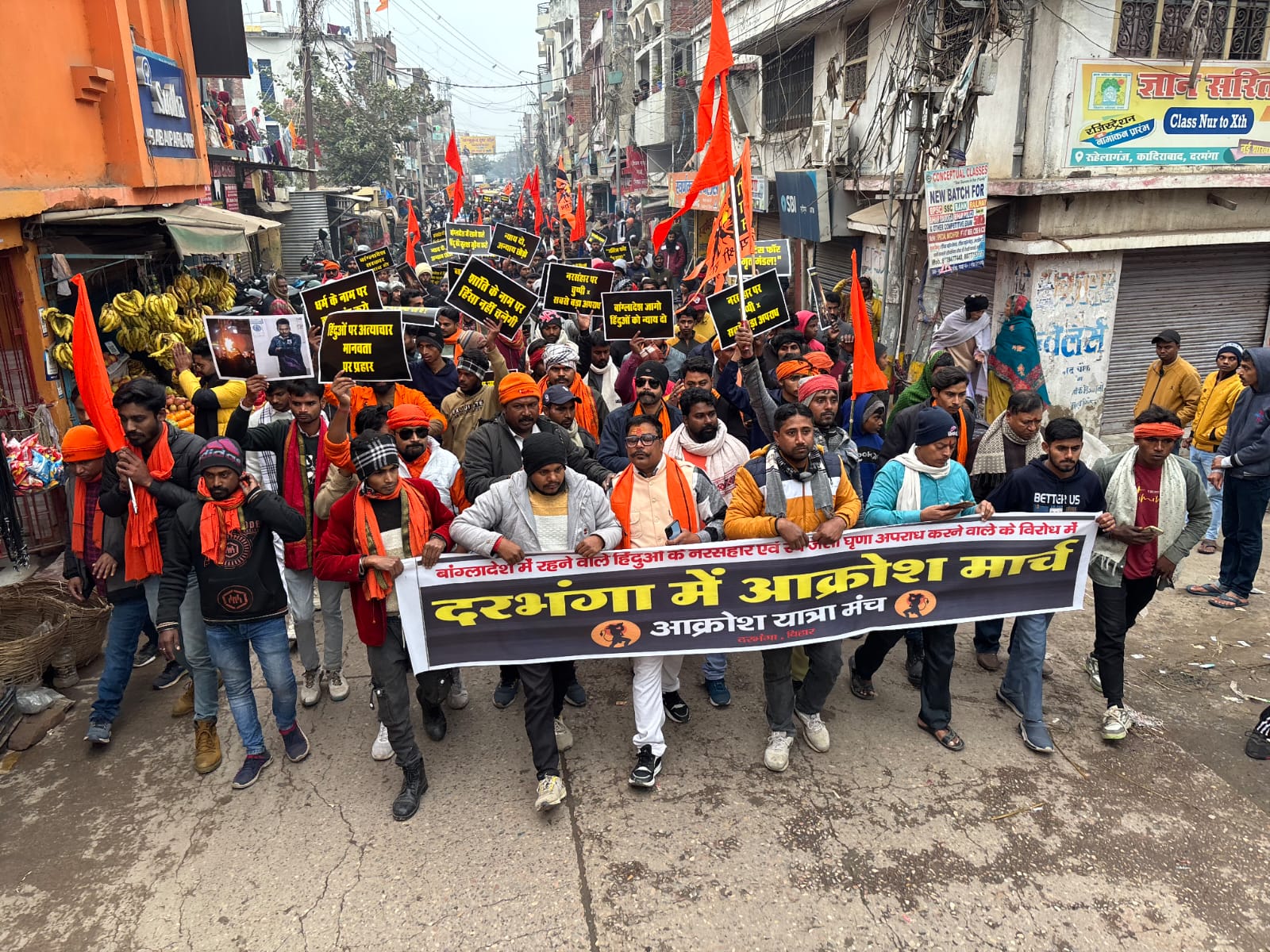 #MNN24X7 दरभंगा| 28 दिसंबर, आक्रोश यात्रा मंच, जिला दरभंगा के तत्वावधान में बांग्लादेश में हिंदू समाज पर हो रहे कथित अत्याचारों के विरोध में रविवार को एक विशाल आक्रोश मार्च निकाला गया। यह मार्च राजीव प्रकाश मधुकर एवं सुरेंद्र सहनी की अध्यक्षता में तथा राहुल कुमार सहनी और रवि कुमार के संयुक्त नेतृत्व में आयोजित हुआ।