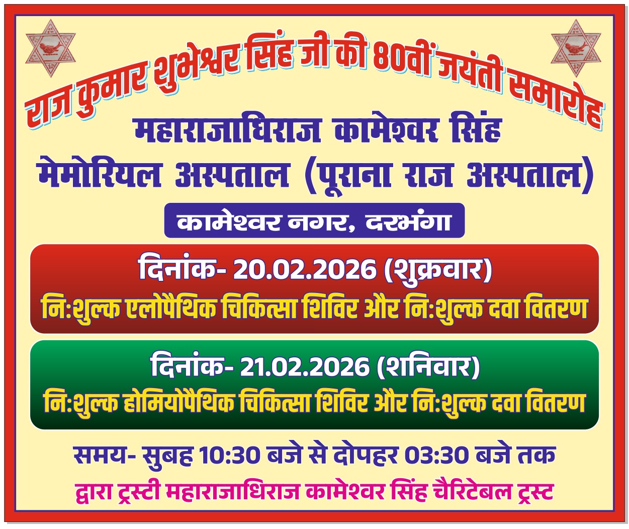 #MNN24X7 दरभंगा, मिथिला की ऐतिहासिक विरासत और राजदरभंगा परंपरा के प्रमुख स्तंभ रहे स्वर्गीय राजकुमार शुभेश्वर सिंह की 80वीं जयंती शुक्रवार को श्रद्धा, सेवा और सामाजिक सरोकार के संकल्प के साथ मनाई गई। इस अवसर पर महाराजा कामेश्वर सिंह मेमोरियल अस्पताल परिसर में भव्य कार्यक्रम का आयोजन किया गया, जहां बड़ी संख्या में गणमान्य नागरिकों एवं समाजसेवियों ने उन्हें श्रद्धांजलि अर्पित की।