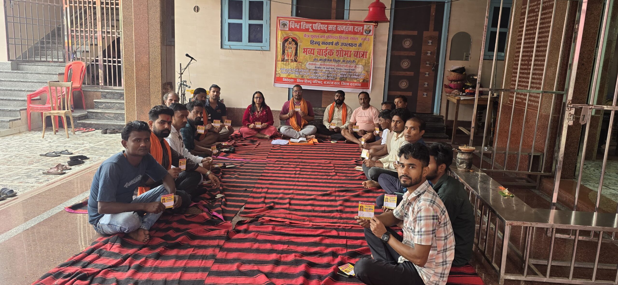 #MNN24X7 दरभंगा, हिंदू नव वर्ष के पावन अवसर पर दरभंगा में भव्य बाइक शोभायात्रा निकालने को लेकर विश्व हिंदू परिषद एवं बजरंग दल, जिला दरभंगा की ओर से रविवार को एक आमसभा आयोजित की गई। बैठक की अध्यक्षता पूर्व वार्ड पार्षद (वार्ड संख्या-34) राम मनोहर प्रसाद ने की, जबकि बैठक का नेतृत्व विश्व हिंदू परिषद के जिला मंत्री राजीव प्रकाश मधुकर ने किया।