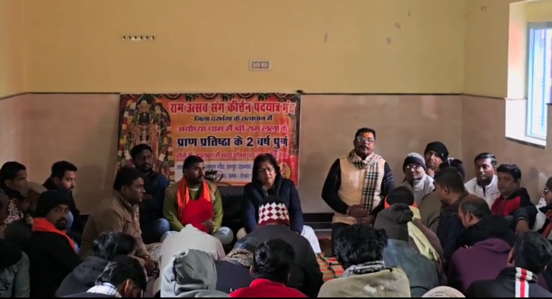 #MNN24X7 दरभंगा, प्रभु श्रीराम लला जी की प्राण प्रतिष्ठा की तृतीय वर्षगांठ के अवसर पर आगामी 22 जनवरी 2026 (गुरुवार) को दरभंगा में भव्य राम उत्सव संकीर्तन पदयात्रा एवं शोभा यात्रा का आयोजन किया जाएगा। इसे लेकर रविवार 21 दिसंबर 2025 को राम जानकी हनुमान मंदिर परिसर में राम उत्सव संकीर्तन पदयात्रा समिति की एक महत्वपूर्ण बैठक आयोजित की गई।