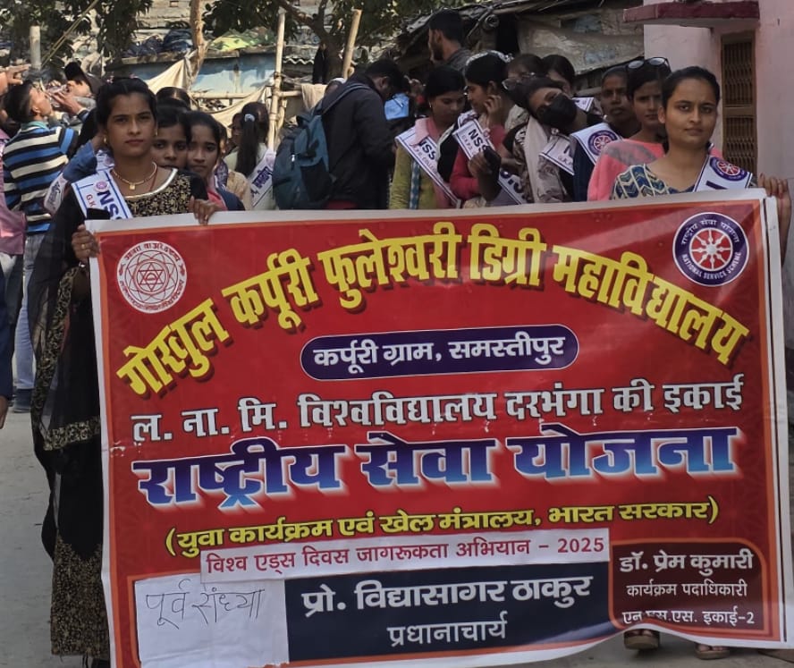 एनएसएस इकाई-2 के कार्यक्रम पदाधिकारी डॉ प्रेम कुमारी के नेतृत्व में स्वयंसेवकों ने एड्स जागरूकता रैली निकाली जो समस्तीपुर नगर निगम के वार्ड नंबर-29 स्थित इकाई द्वारा गोद लिए गए मोहल्ले सलेमपुर में तथा कर्पूरीग्राम स्टेशन पर जाकर आमलोगों को एचआईवी एवं एड्स फैलने के कारणों, दुष्प्रभावों एवं बचाव के उपाय से घर-घर जाकर अवगत कराया। डॉ प्रेम कुमारी ने कहा कि एड्स फालने के चार कारणों में मुख्य रूप से असुरक्षित यौन संबंध बड़ा कारण है। इसकी सही और पूरी जानकारी देकर लोगों के बहुमूल्य जीवन को बचाया जा सकता है। इसके लिए सूचना, शिक्षा तथा जन जागरूकता आवश्यक है। उन्होंने बताया कि ‘एक पत्नी और एक पति व्रत’ का ईमानदारी से पालन करने से एड्स से समाज को बचाया जा सकता है