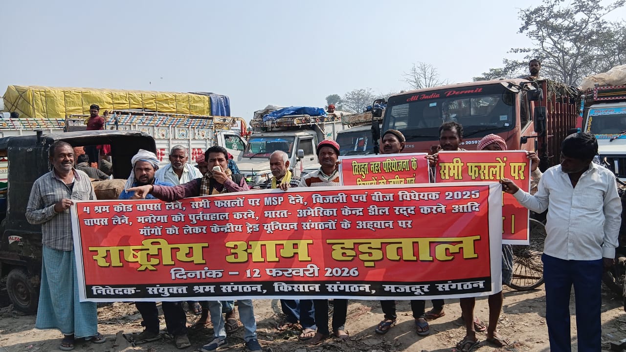 #MNN24X7 ताजपुर/समस्तीपुर, 11 फरवरी, 4 श्रम कोड, मनरेगा में बदलाव, बिजली एवं बीज विधेयक 2025 वापस लेने, सभी फसलों को एमएसपी लागू करने आदि मांगों को लेकर 12 फरवरी को आहूत राष्ट्रीय आम हड़ताल को बड़ी भागीदारी से सफल बनाने का अह्वान उपस्थित मजदूरों भाकपा माले प्रखंड सचिव सुरेंद्र प्रसाद सिंह ने बुधवार को जनता मैदान में “मजदूर सभा” को संबोधित करते हुए किया। सभा की अध्यक्षता खेग्रामस प्रखंड सचिव प्रभात रंजन गुप्ता ने किया। मौके पर भाकपा माले के मो० एजाज, मो० क्यूम, मो० शाद आदि उपस्थित थे।