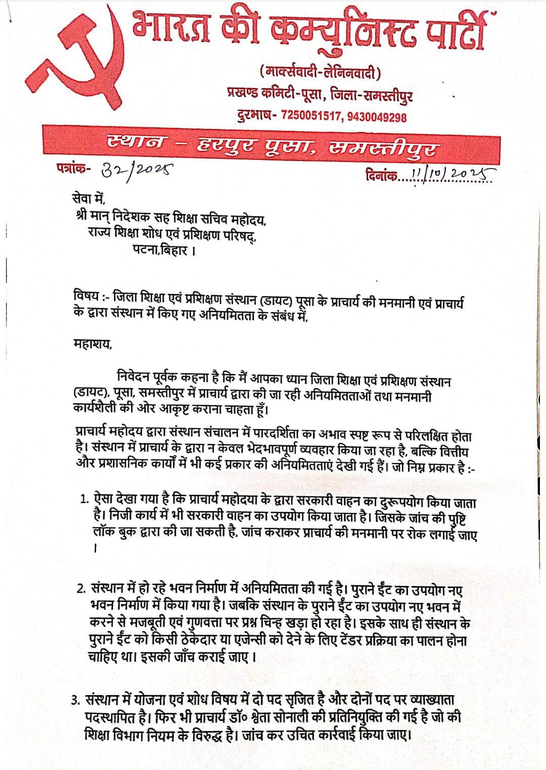 #MNN24X7 पूसा /समस्तीपुर 29 दिसंबर भाकपा-माले के प्रखंड सचिव सह जिला स्थाई समिति सदस्य अमित कुमार ने प्रेस विज्ञप्ति जारी कर कहा है कि जिला शिक्षा एवं प्रशिक्षण संस्थान (डायट) पूसा में प्रभारी प्राचार्य श्वेता सोनाली के द्वारा सरकारी वाहन का दुरूपयोग किया जाता है। निजी कार्य में भी सरकारी वाहन का उपयोग किया जाता है। जिसके जांच की पुष्टि लॉक बुक द्वारा की जा सकती है। संस्थान में हो रहे भवन निर्माण में अनियमितता की गई है। पुराने ईंट का उपयोग नए भवन निर्माण में किया गया है। जबकि संस्थान के पुराने ईंट का उपयोग नए भवन में करने से मजबूती एवं गुणवत्ता पर प्रश्न चिन्ह खड़ा हो रहा है। इसके साथ ही संस्थान के पुराने ईंट को किसी ठेकेदार या एजेन्सी को देने के लिए टेंडर प्रक्रिया का पालन होना चाहिए था। संस्थान में योजना एवं शोध विषय में दो पद सृजित है और दोनों पद पर व्याख्याता पदस्थापित है। फिर भी प्राचार्य डॉ० श्वेता सोनाली की प्रतिनियुक्ति की गई है जो की शिक्षा विभाग नियम के विरुद्ध है। प्रभारी प्राचार्य का ननिहाल, ससुराल समस्तीपुर जिला में है। व बगल के ही जिला पातेपुर के समीप माईके है फिर भी इनकी नियुक्ति गृह जिला में की गई। जो की व्यय एवं निकासी पदाधिकारी भी है, जो कि शिक्षा विभाग नियम के विरुद्ध है। संस्थान के छात्रावास प्रभारी प्रतिदिन दूसरे जिला से आते-जाते हैं।, जबकि पदाधिकारी को संस्थान से 8 किलोमीटर के अंदर ही रहना होता है। प्राचार्य प्रतिदिन संस्थान में सरकारी वाहन से अपने घर से आना-जाना करते हैं जो शिक्षा विभाग के नियम के विरुद्ध है।
