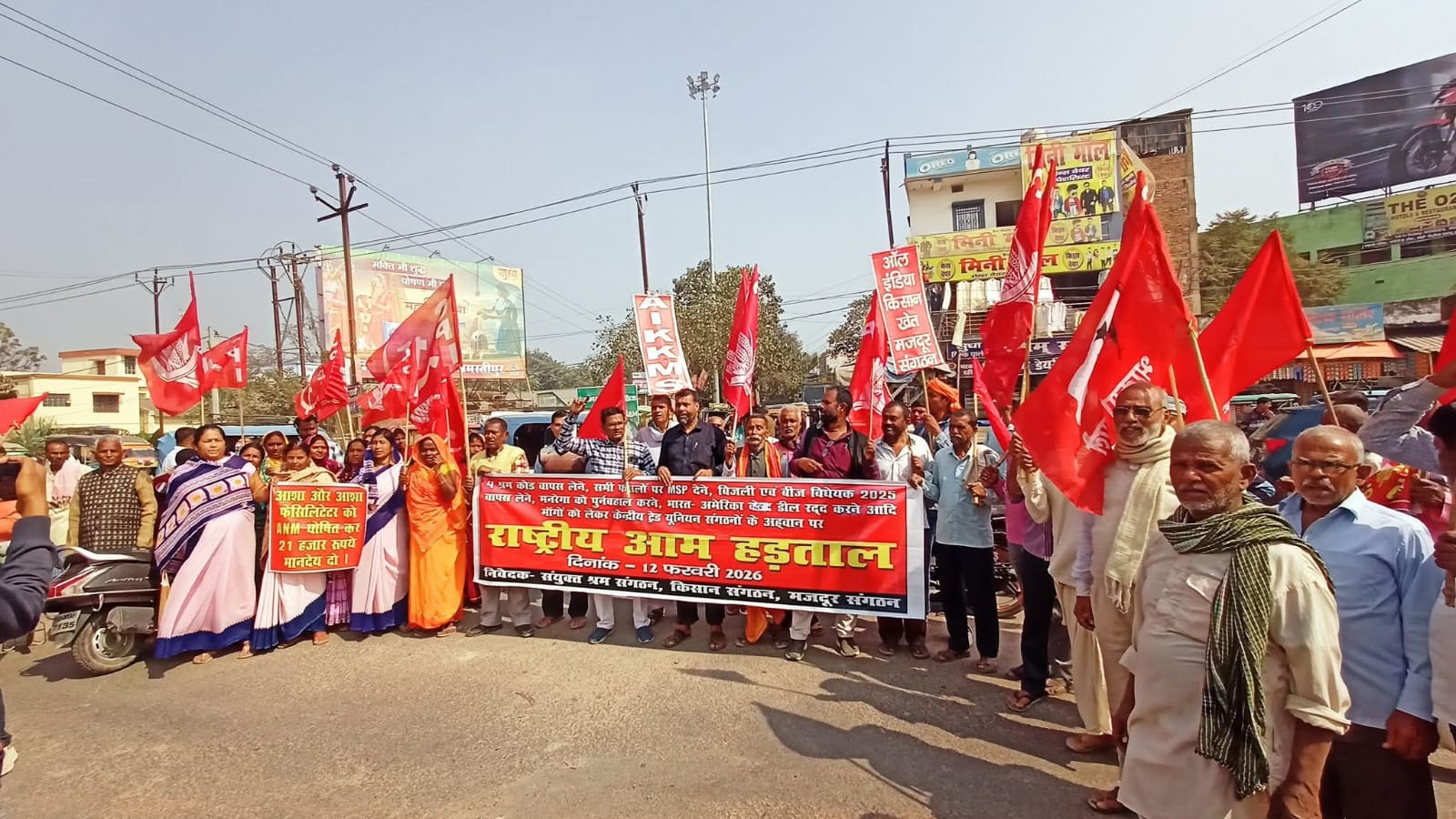 #MNN24X7 ताजपुर/समस्तीपुर, 12 फरवरी भारत-अमेरिका ट्रेड डील रद्द करने, चार श्रमकोड, मनरेगा में बदलाव, बिजली एवं बीज विधेयक 2025 वापस लेने, फसलों पर एमएसपी लागू करने आदि मांगों को लेकर राष्ट्रीय आम हड़ताल पर संयुक्त श्रम-किसान-मजदूर संगठनों द्वारा ताजपुर गांधी चौक से जुलूस निकालकर बाजार भ्रमण करते हुए ताजपुर प्रखंड मुख्यालय चौक पर जोरदार प्रदर्शन-सभा किया।